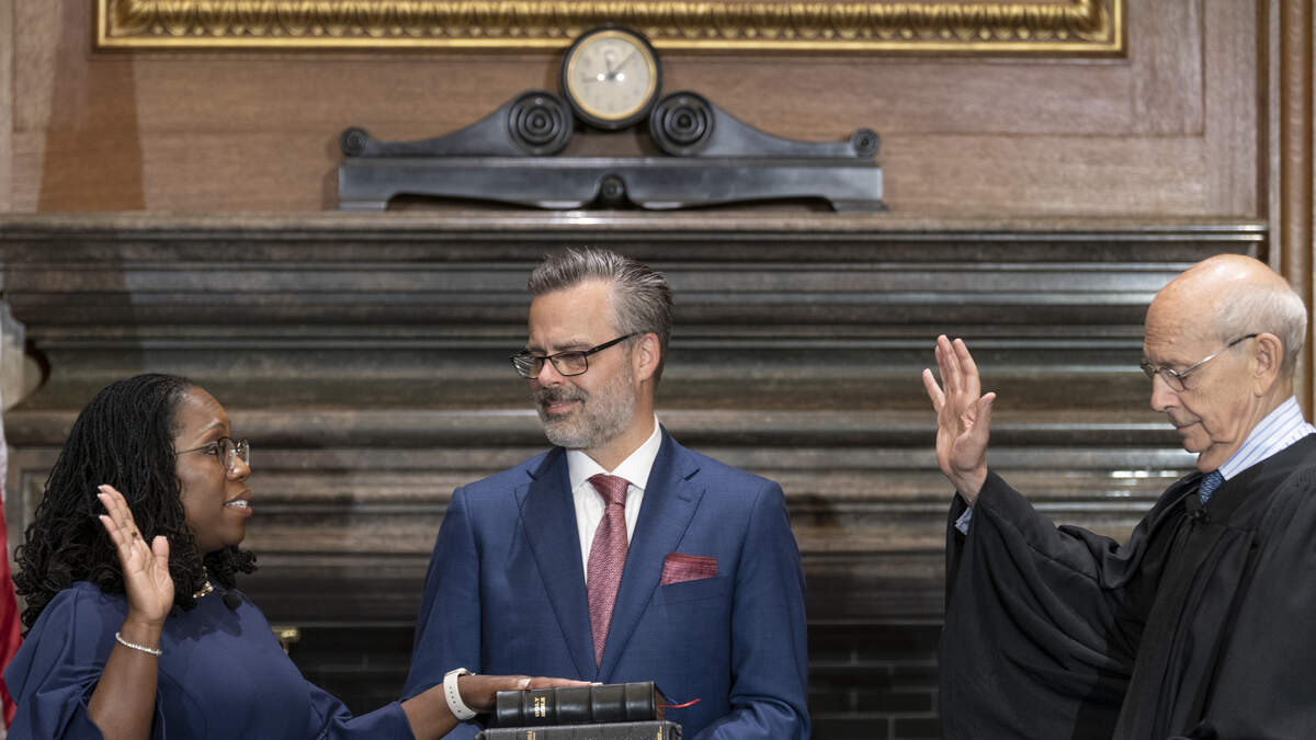 Her swearing-in coincided with the formal retirement of veteran Justice Breyer. Chief Justice John Roberts administered the constitutional oath of office while Breyer administered the judicial oath.